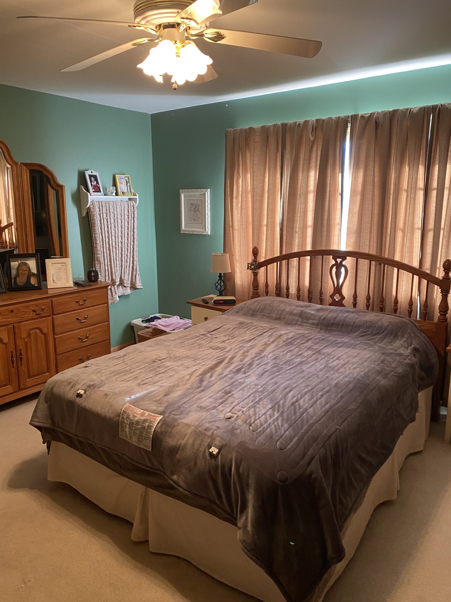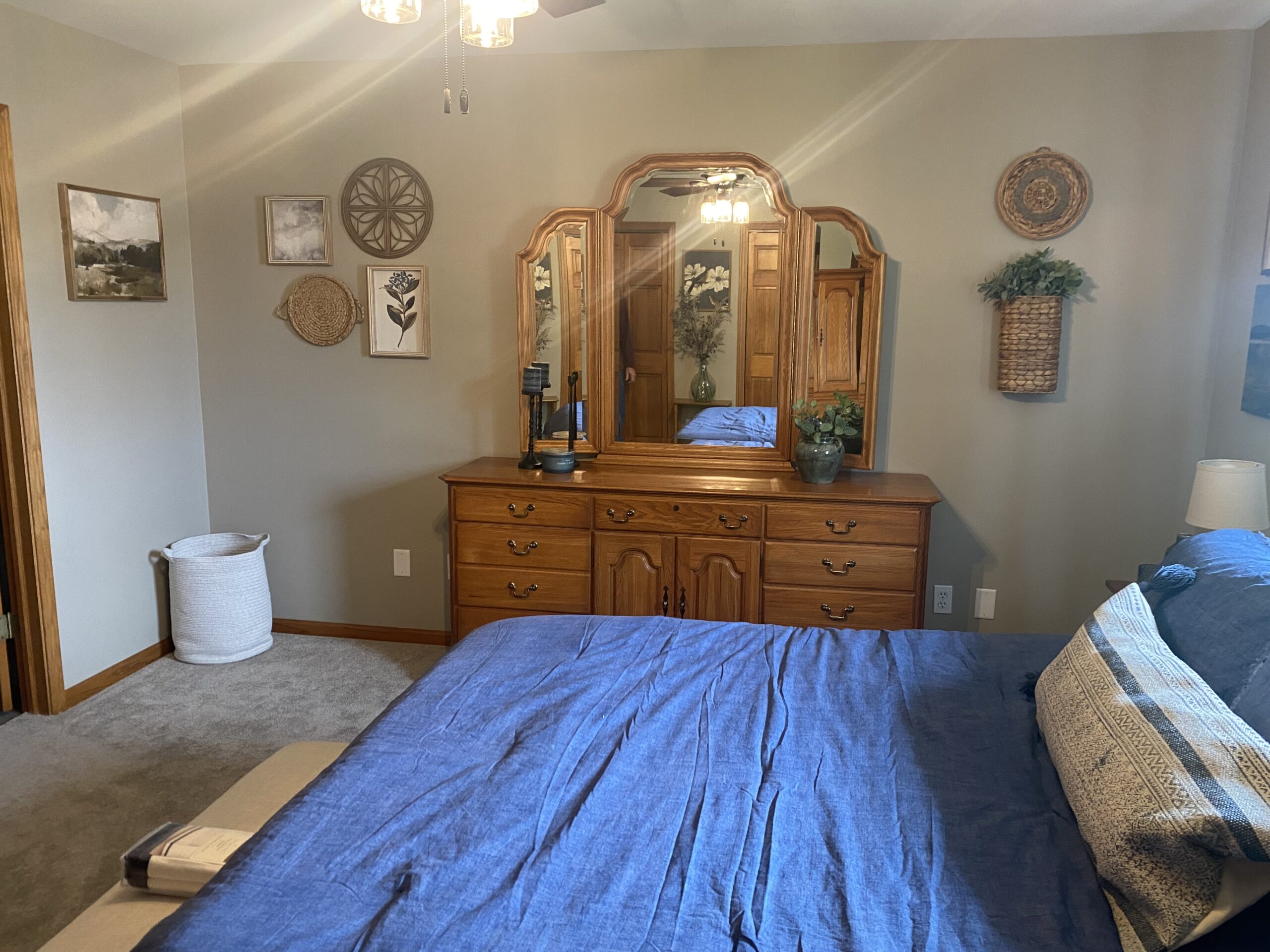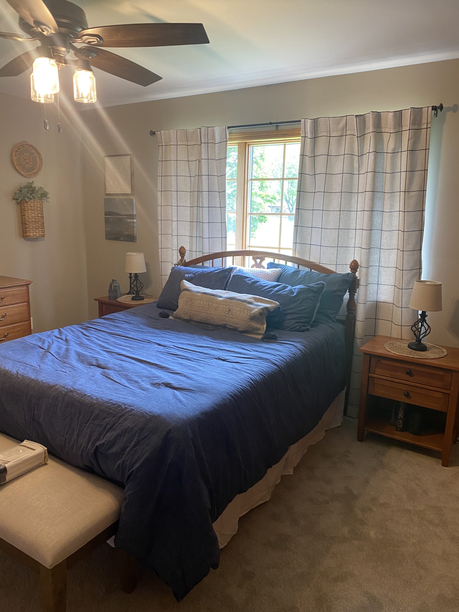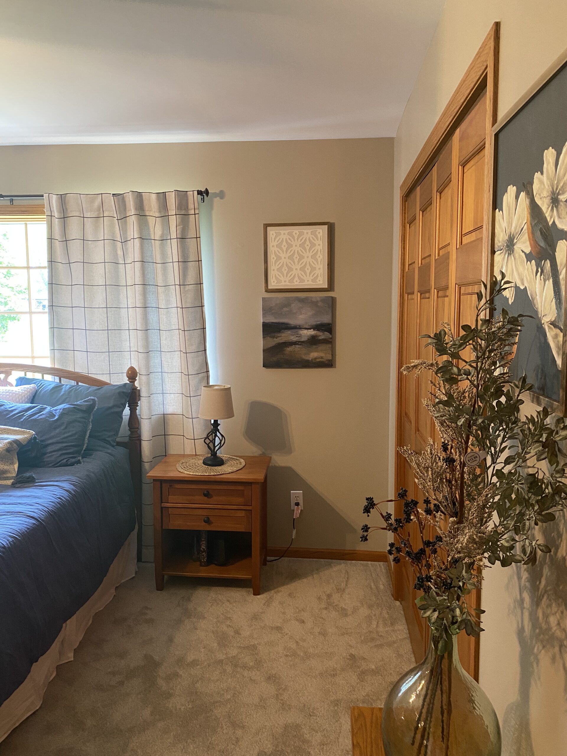 This bedroom just needed a little TLC. The main furniture stayed – but new carpet, paint, window treatments, and decor is just what the space needed!