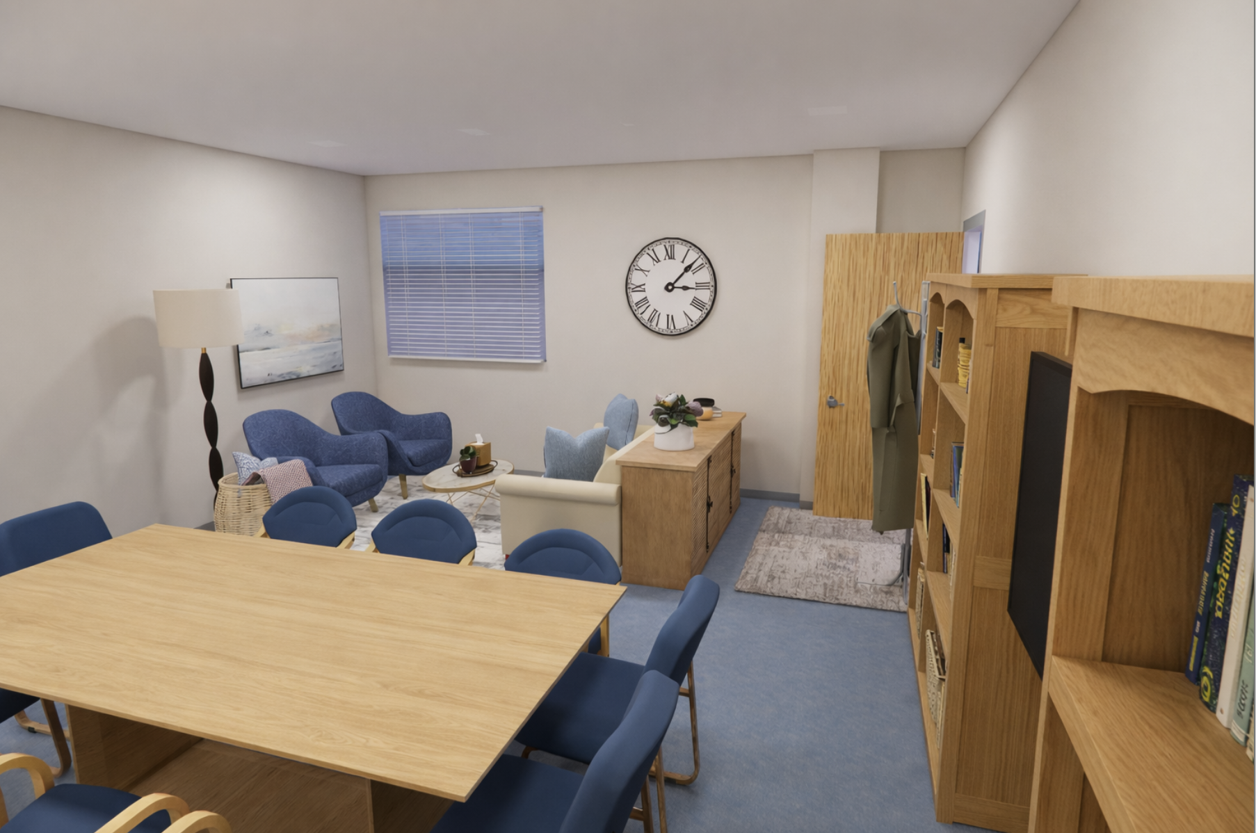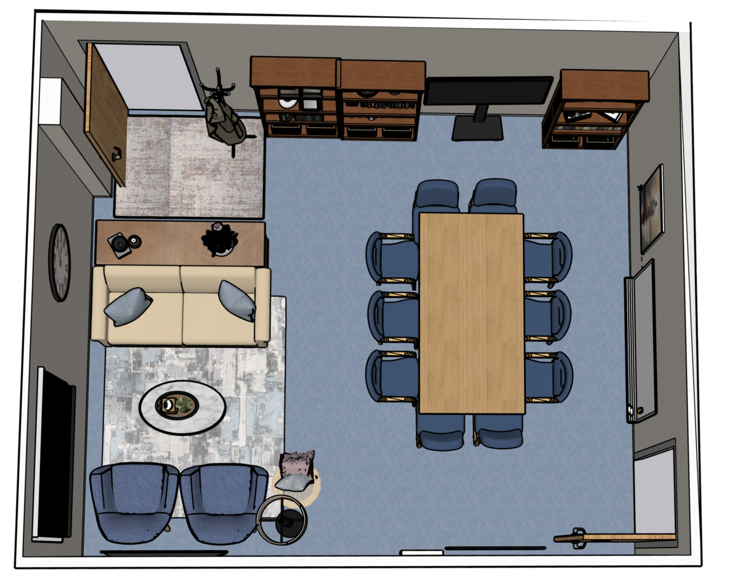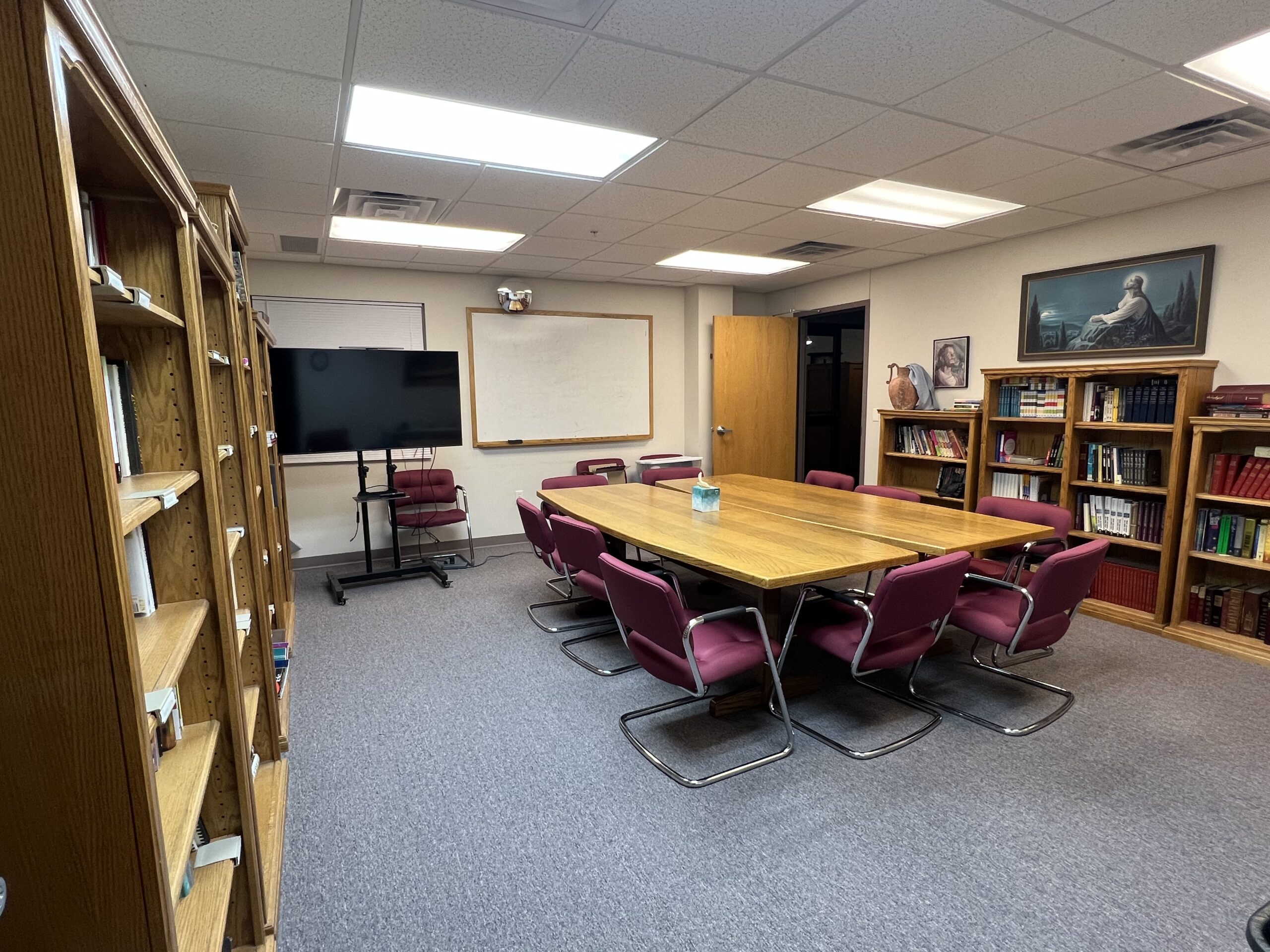 Reimagined as a flexible gathering space, this room now supports both structured meetings and casual connection. A cozy seating area invites conversation, while the layout easily transitions back to a functional meeting space when needed.