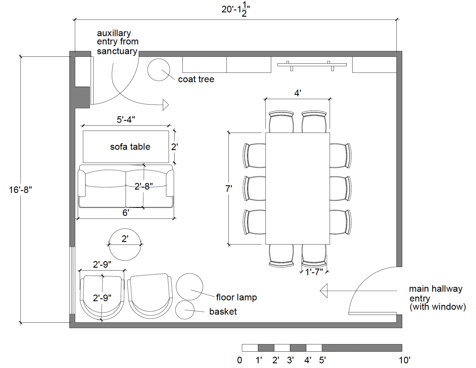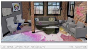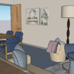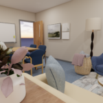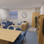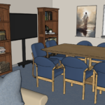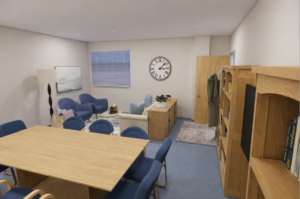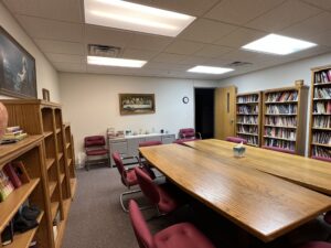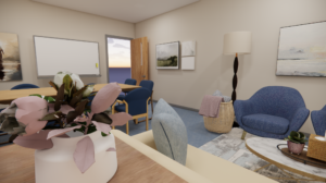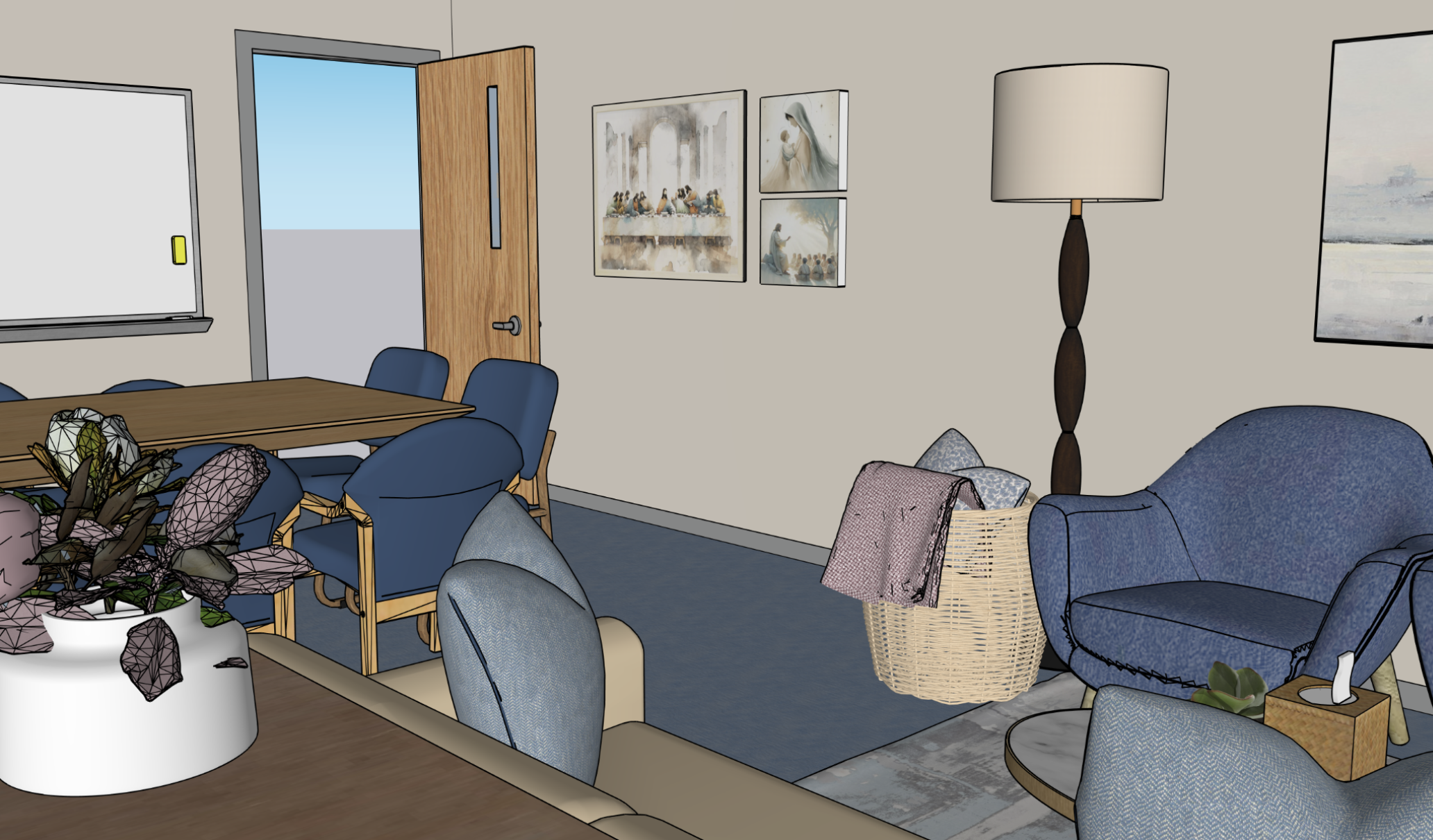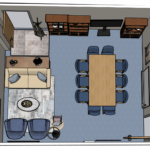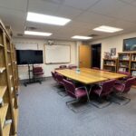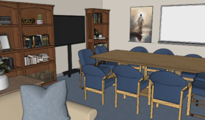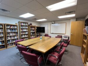 Reimagined as a flexible gathering space, this room now supports both structured meetings and casual connection. A cozy seating area invites conversation, while the layout easily transitions back to a functional meeting space when needed.
