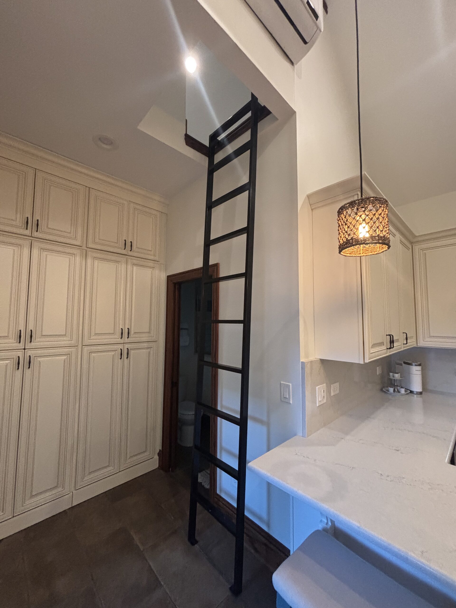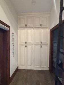 Before: The ceilings were too low, so were were able to raise them. The room was closed off, so we took out part of the wall. These old cabinets would be reused in the basement storage room.